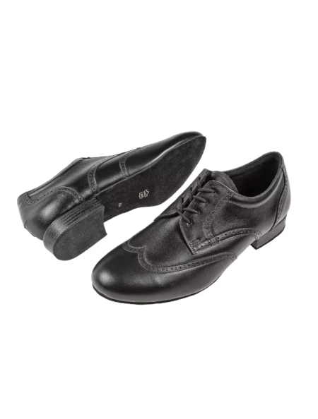 Chaussures de danse pour homme Diamant, fabriquées en Allemagne, confectionnées à la main dans un style Derby classique, avec une couture Lycra décorative et un laçage ouvert à 4 œillets, ainsi qu'un bord supérieur rembourré. Ces chaussures de danse sont disponibles en largeur H (confortable) et dotées d'un talon standard de 2 cm amortissant les chocs. La doublure intérieure est en microfibre respirante et absorbante, provenant d'un fabricant italien haut de gamme. L'empeigne en cuir noir est réalisée en nappa italien de grande qualité.
