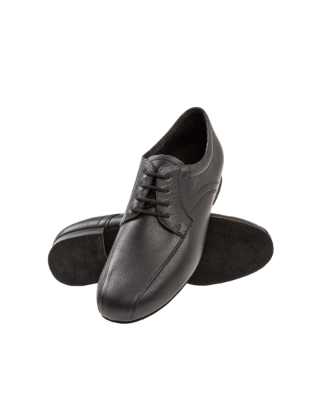 Chaussures de danse pour homme fabriquées en Allemagne, confectionnées à la main dans un style Derby sportif, avec un laçage ouvert à 4 œillets et un bord supérieur rembourré. Ces chaussures de danse sont disponibles en largeur H (confortable) et dotées d'un talon standard de 2 cm amortissant les chocs. La doublure intérieure est en microfibre respirante et absorbante, provenant d'un fabricant italien haut de gamme. La tige en cuir noir est réalisée en nappa italien de grande qualité.