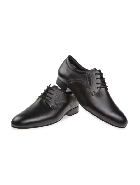 Chaussures de danse pour homme fabriquées en Allemagne, confectionnées à la main dans un style Derby sportif, avec un laçage ouvert à 4 œillets et un bord supérieur rembourré. Ces chaussures de danse sont disponibles en largeur H (confortable) et dotées d'un talon standard de 2 cm amortissant les chocs. La doublure intérieure est en microfibre respirante et absorbante, provenant d'un fabricant italien haut de gamme. La tige en cuir noir est réalisée en nappa italien de grande qualité.