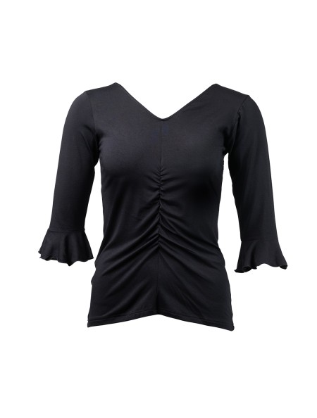 Haut de danse pour femme Talvi en noir avec encolure en V et manches à volants – pour la salsa, le tango et bien plus encore. Le haut de danse Talvi, en noir élégant et composé d’un mélange ultra-doux de bambou et d’élasthanne, offre un confort maximal. Il présente une encolure classique en V ainsi qu’une fronce décorative à l’avant. Les manches ¾ sont ornées de volants subtils, et le centre avant donne un effet légèrement froncé. Ce haut noir épouse agréablement le corps tout en assurant une liberté de mouvement optimale. Parfaitement assorti : notre jupe de danse Liya, fabriquée dans le même tissu – une combinaison idéale sur la piste de danse, que ce soit pour le tango, les danses standards, la bachata ou la salsa.